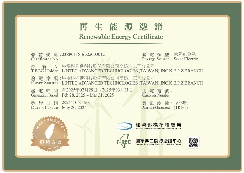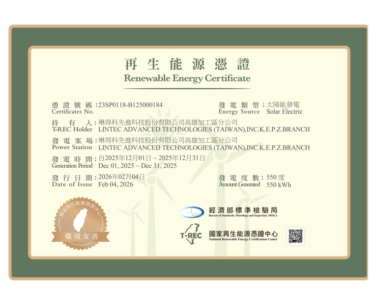 琳得科自2018年起啟用第一期太陽能發電設施,且於2023年6月增設第二期設施,並取得再生能源憑證。我們以實際行動持續為地球貢獻一份心力,期許能與社會共存共榮,共創永續發展的未來。