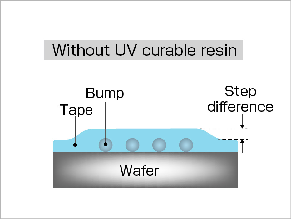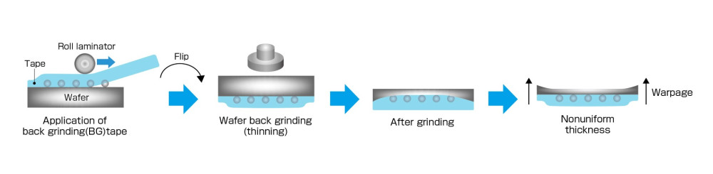 然而,在正面(電路面)上形成有「錫球(Bump)」等突起電極的晶圓,其中央與邊緣常存在高低落差。在進行背面研磨前貼附保護表面的「研磨用保護膠帶(Back Grinding Tape)」時,晶圓邊緣會產生段差,這也成為研磨過程中產生裂紋(Crack,如缺角或裂縫)的原因。
