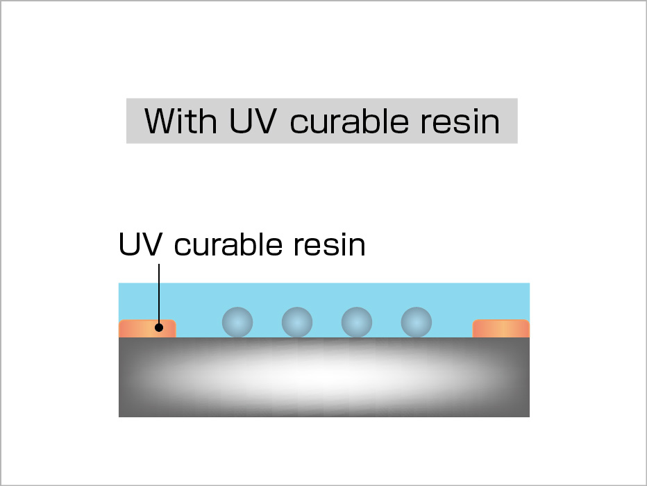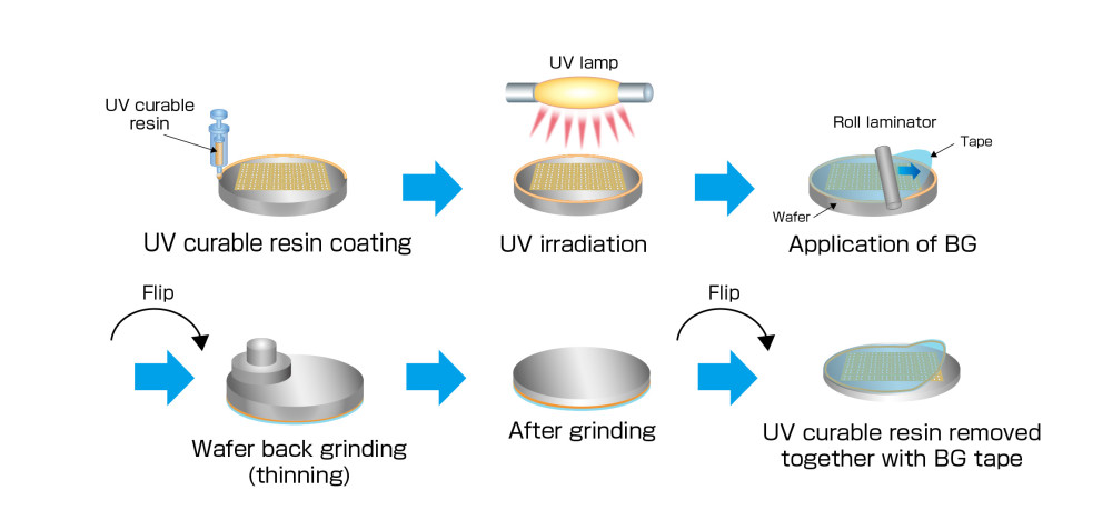因此,本公司開發了全新的 「PCBL 製程」。透過在沒有錫球的晶圓邊緣塗佈 UV 硬化型樹脂來消除段差,進而降低研磨後的厚度偏差及減少裂紋產生的風險。