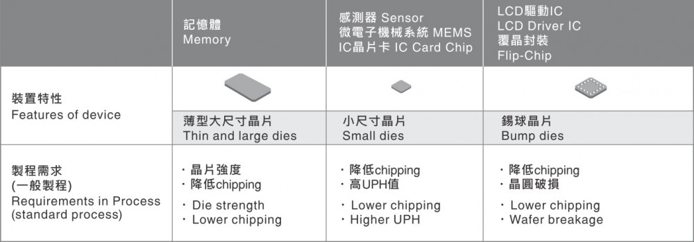 DBG製程與一般製程相較,可降低晶背chipping之發生,且在晶圓變薄前先完成刀切,因此在研磨製程中可解決 chipping問題。因晶背chipping減少,可增強晶片強度,經應力釋放製程後,可移除微裂痕而產生